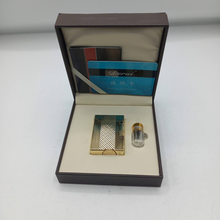 فندک گازی توربو DERUI طلایی VIP - بدنه بافت الماسی سهبعدی، شعله ضد باد و جعبه چرم دست دوز